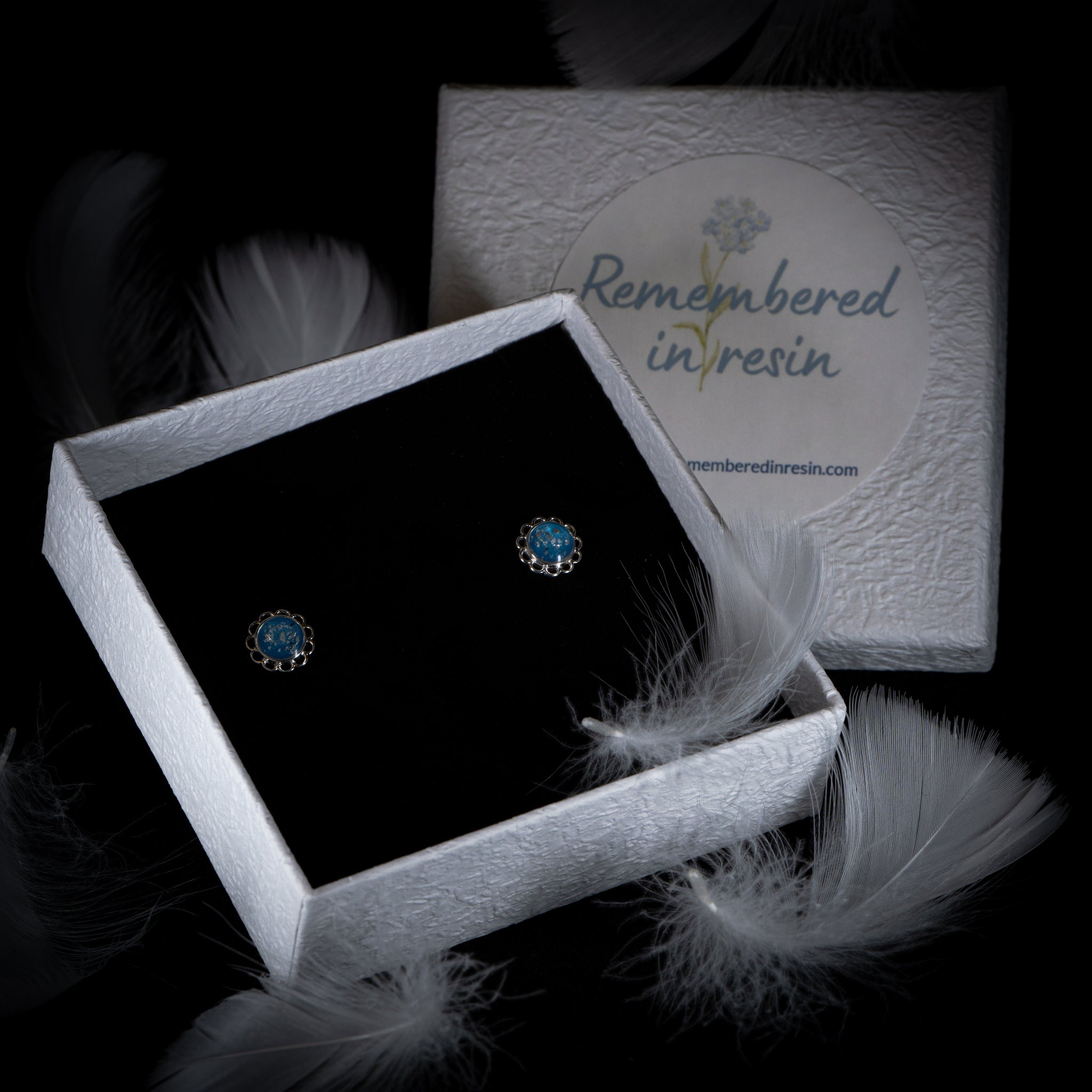 Here's an example of our 925 Sterling Silver frill-edge stud earrings, finished in Bowland Blue. Encased with the ashes of a dearly loved pet, this piece will keep them close to their owner's heart.
